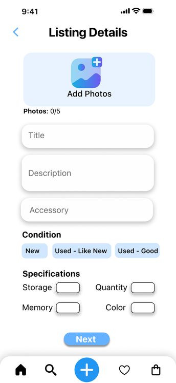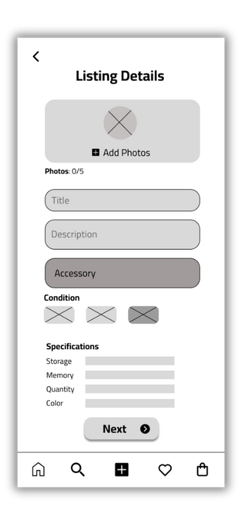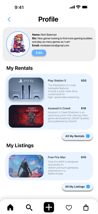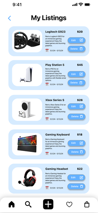 This prototype allows users to list their gaming equipment for rent on the GameShare platform. It explores the listing process, from clicking the add product icon, selecting the type of item, uploading photos, selecting rental dates, to submitting the listing. This user-friendly prototype was based on design sketches and user research, focusing on users' needs to rent out their equipment. It informed the development of a comprehensive listing feature in the final design. The step-by-step process and use of icons enhance usability and clarity.