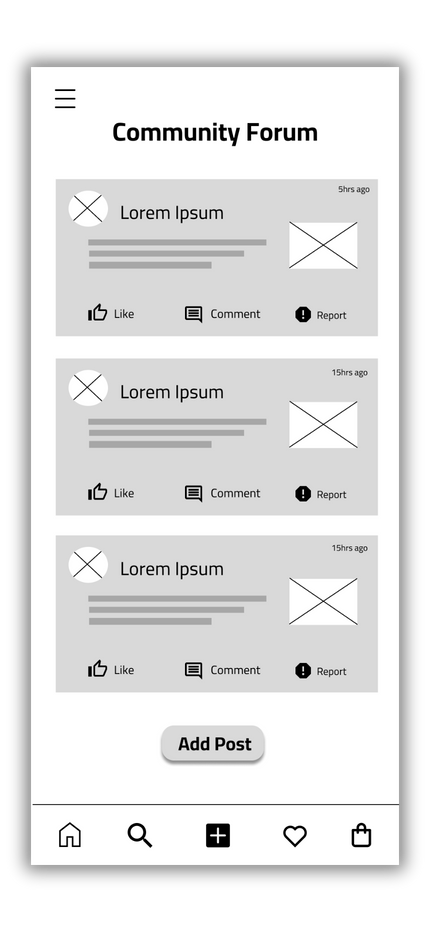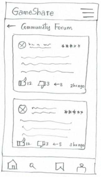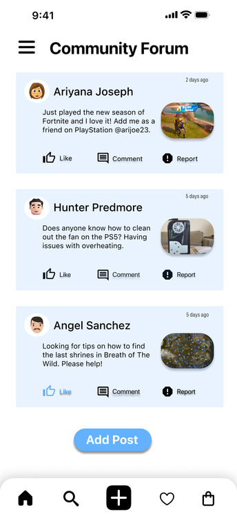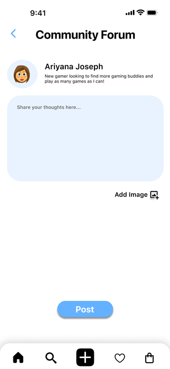 This prototype enables users to share their thoughts within the gaming community by creating posts in a forum. It guides users through accessing the forum via the hamburger menu, uploading images from the gallery, and submitting posts. The flow is intuitive, with clear prompts and labels. Built on user personas and design sketches, this prototype helped refine the community forum's interface and functionality in the high-fidelity version. It emphasized the importance of community engagement for the target audience.
