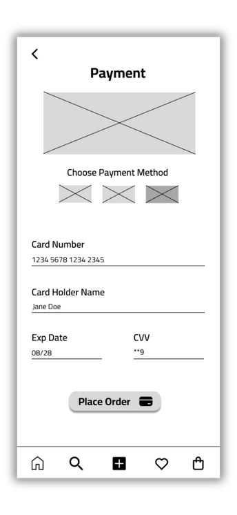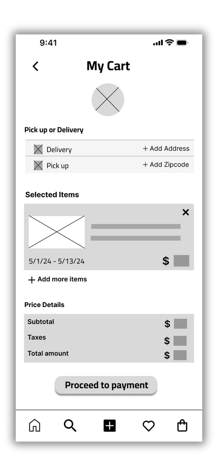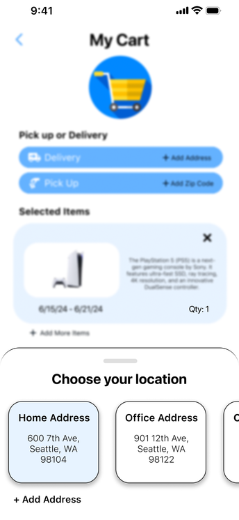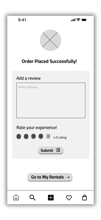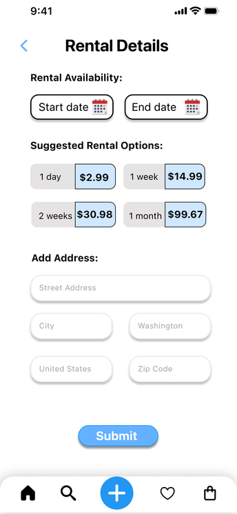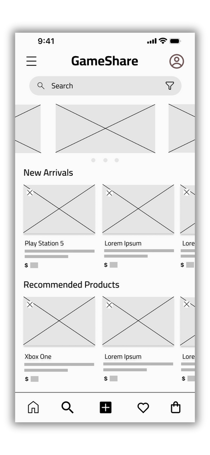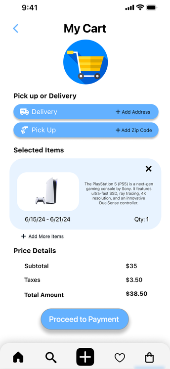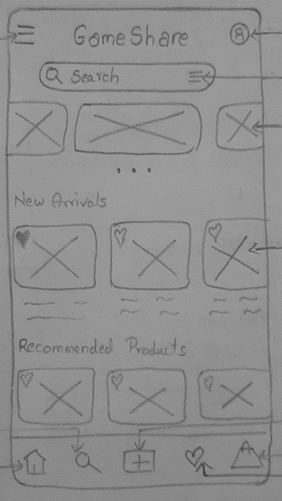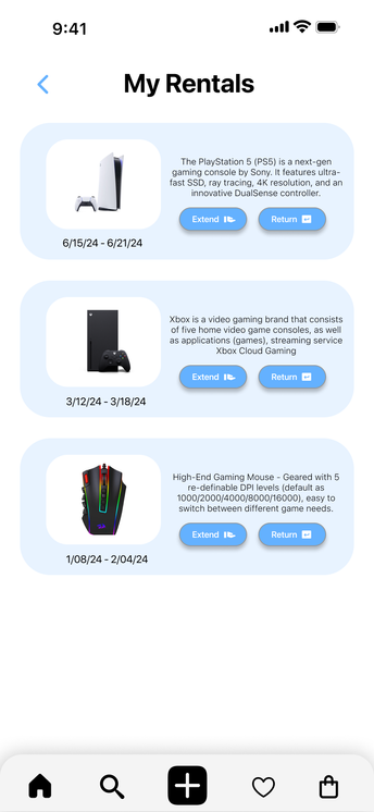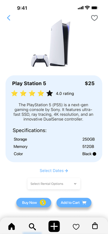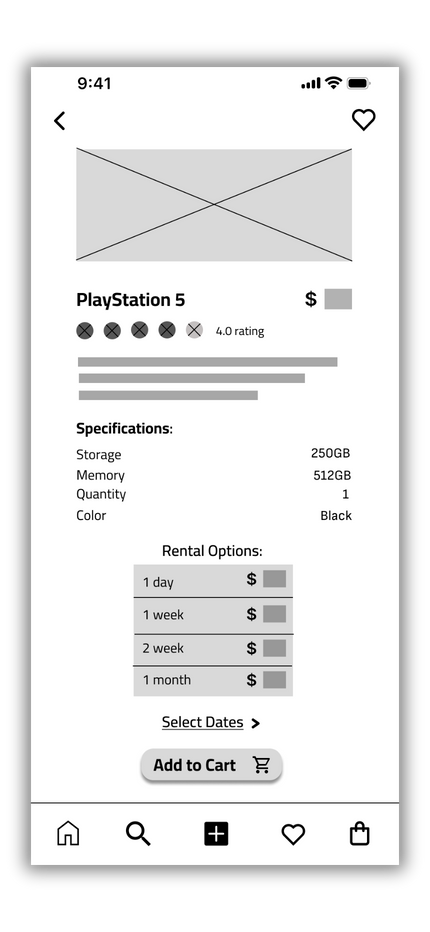 This prototype allows users to sign up for the GameShare application and rent a product of their choice. It visualizes and tests the user flow from searching for a product, viewing details, adding it to the cart, selecting rental dates, entering payment information, and confirming the rental. The user interactions are straightforward, leveraging icons and labels for a user-friendly experience. This prototype was based on initial design sketches and personas, and it informed the development of high-fidelity prototypes and the final product design.