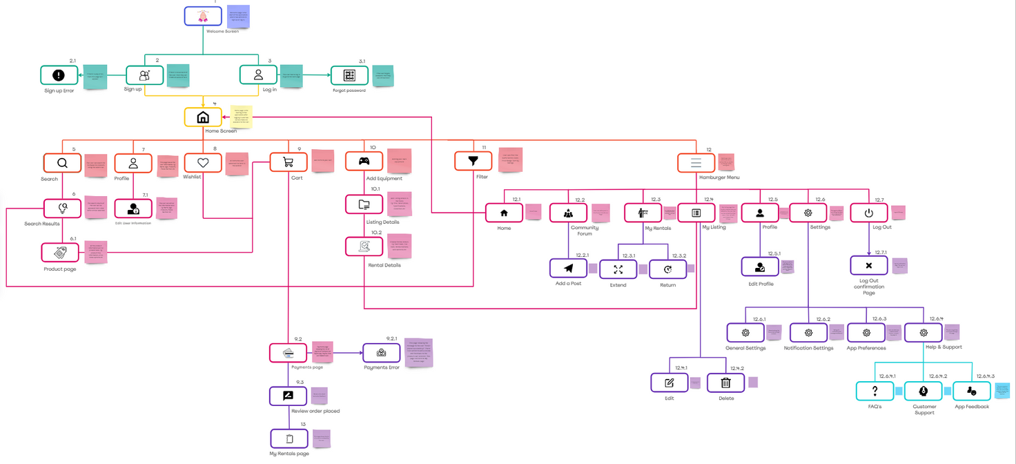 The sitemap is a visual representation of our GameShare application. created to navigate the product between various pages. It provides a complete overview of user navigation within the app, from entry points to various features and options. Below is a detailed view of our sitemap, showcasing the structure and connections within the application.
